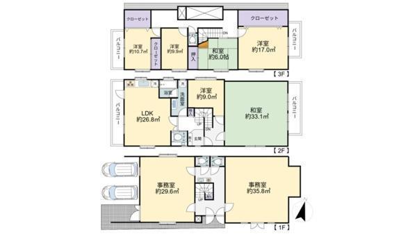1F 洋 21.6帖 、1F 洋 17.9帖 、2F 和 20.0帖 、2F LDK 16.2帖 、2F 洋 5.4帖 、3F 洋 10.2帖 、3F 和 6.0帖 、3F 洋 6.4帖 、3F 洋 5.9帖
